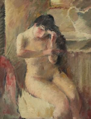 Nu se peignant, huile sur toile signée, 41,5 x 33 cm