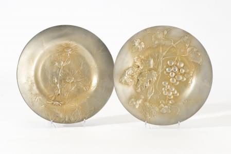 Paire d'assiettes à décor de grappes et fleurs, argent, signées...