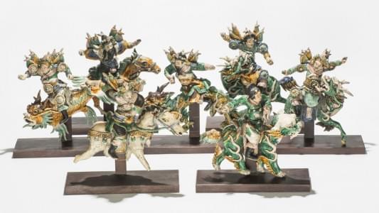 760. Sept tuiles faîtières figurant des cavaliers