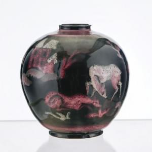 Vase ovoïde, céramique émaillée noir et pourpre à décor d'antilo...