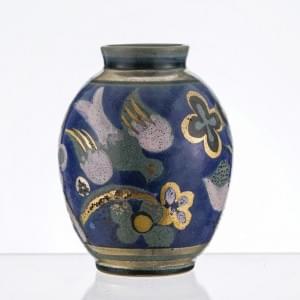Vase ovoïde, céramique émaillée bleu nuit à décor d'oiseaux, sig...