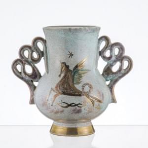 Vase ovoïde, céramique émaillée rose à décor de sirènes et cheva...