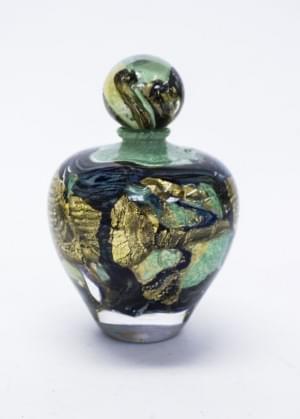 Flacon couvert, verre soufflé, marbrures bleues or et céladon, s...