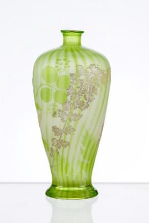 Vase à décor de fleurs, pâte de verre verte et rose, H 28 cm