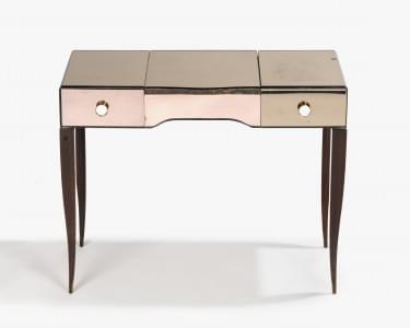 Deux tiroirs, un abattant, piètement légèrement galbé, verre fum...
