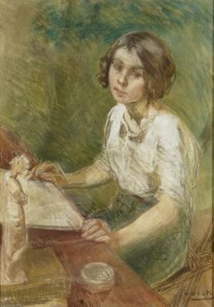 Jeune fille à sa table d'écriture, pastel sur papier signé, 64,5...