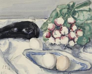 Les trois amandes, huile sur panneau, signée 1975, 38x27 cm