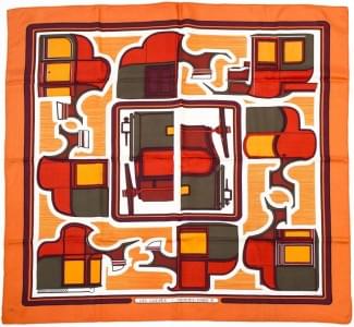 Carré en soie à décor de voitures à chevaux sur fond orange et f...