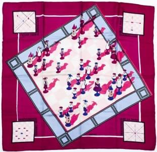 Carré en soie à décor de jeu d'échecs sur fond rose et framboise...