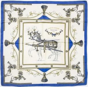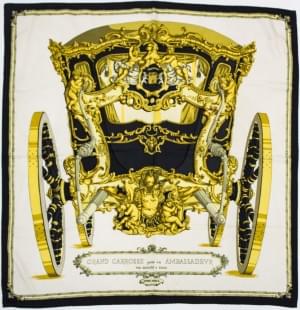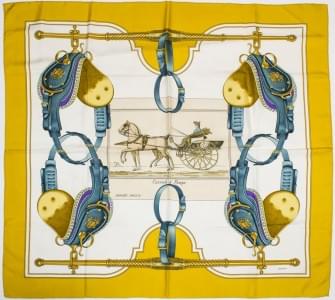 Carré en soie à décor de voiture à cheval sur fond crème et jaun...