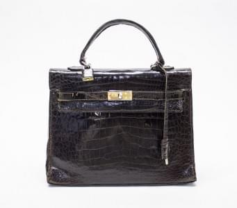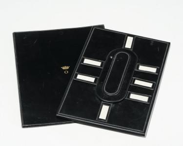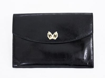 Cuir lisse noir, garniture en métal doré, fermoir à décor de mor...