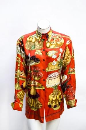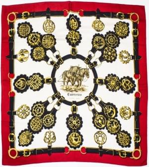 Carré en soie à motif de chevaux sur fond crème et rouge, 89x86...