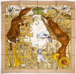 Carré en soie à décor de scène de chasse sur fond crème et beige...