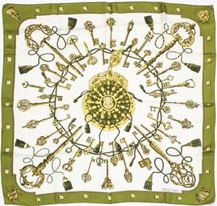 3025. Hermès, foulard à motifs de clés sur fond crème et vert