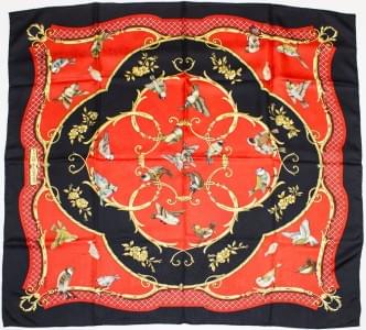 Carré en soie à motif d'oiseaux sur fond rouge et noir, 91x88 cm