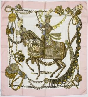 3029. Hermès, foulard à motif d'un cavalier doré sur fond crème et ros...