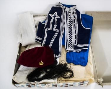Comprend une chemise blanche, un gilet bleu à liseré blanc, des...