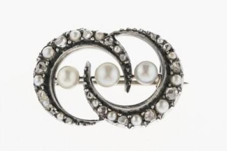 3109. Broche formant deux croissants de lune sertis de diamants en ros...