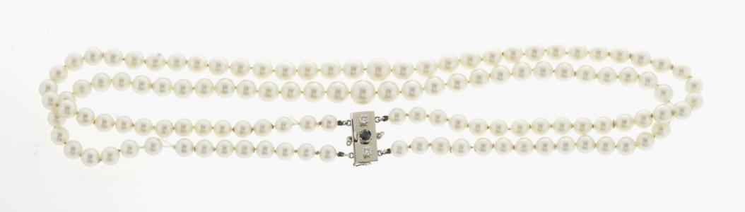3123. Collier deux rangs de perles retenus par un fermoir serti de dia...