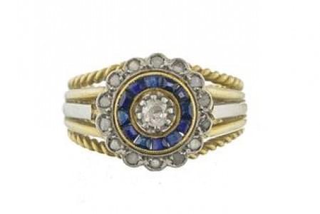3171. Bague fleur sertie d'un diamant entouré de saphirs calibrés et r...