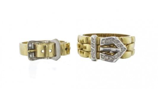 3229. Deux bagues formant un motif de ceinture serti de diamants
