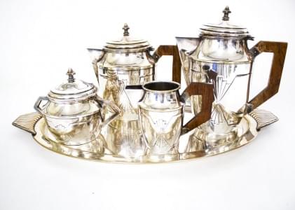 Métal argenté et bois exotique, comprenant: théière, cafetière,...