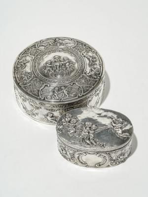3478. Deux boîtes, l'une rectangulaire l'autre ronde à décor de scènes...
