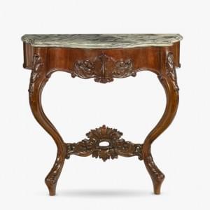Bois naturel sculpté, marbre gris, Angleterre, XIXe, 77x84x44 cm