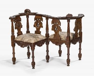 Bois naturel à décor sculpté de têtes, rinceaux et feuillages, L...