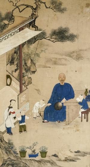 Scène de genre avec père, enfants et concubine, gouache et encre...