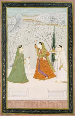Jeune femme et servantes dans un jardin, pigment sur papier, 29,...