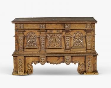 Chêne sculpté, façade architecturée à décor de motifs, poignée l...