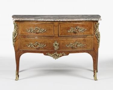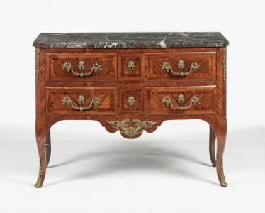 Trois tiroirs sur deux rangs, bois de placage, bronze doré et ma...