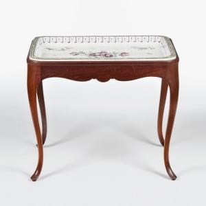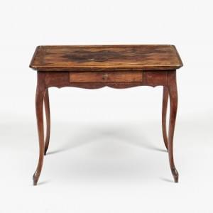 Plateau marqueté de rinceaux, pieds ornés de mascarons, bois fru...