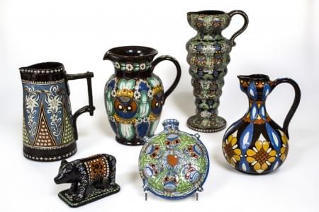3211. Suite de quatre pichets, une gourde et une tirelire, Thoune