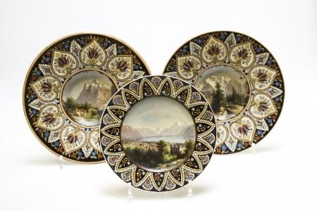 À décor de vues de Suisse, céramique émaillée, D 19 à 24 cm