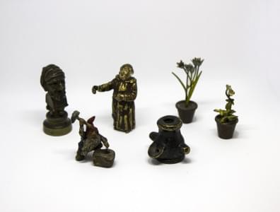3230. Ensemble de six statuettes : deux pots de fleurs, un buste de fa...