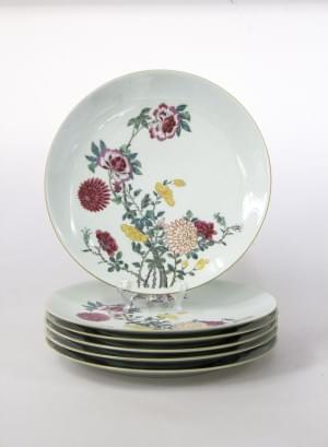 3241. Six assiettes à décor de fleurs famille rose, style Compagnie de...