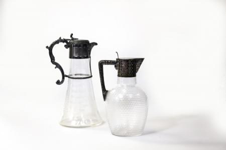 3297. Deux carafes, l'une martelée, l'autre gravée de brindilles et gu...