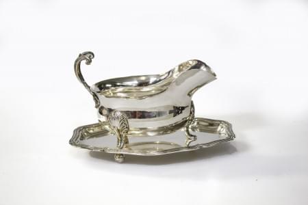 3303. Une saucière tripode à motif de coquilles sur présentoir festonn...