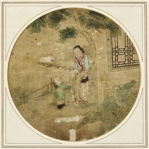 Jeune femme et enfants, peinture sur soie, H 25 cm