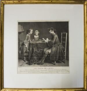 Les tours de cartes et le jeu de l’oye, deux gravures par Surugu...