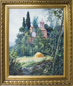 Eglise dans les arbres, huile sur toile, signée, 55x46 cm