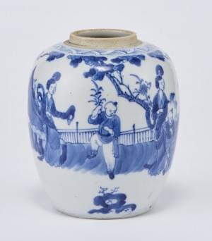 Porcelaine émaillée bleu blanc, à décor d'enfants et d'une serva...