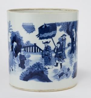 Porcelaine émaillée bleu blanc à décor d'un dignitaire et de per...
