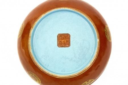 Porcelaine émaillée corail à décor de médaillons or, intérieur t...
