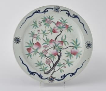Porcelaine émaillée polychrome à décor de pêches, D 36 cm