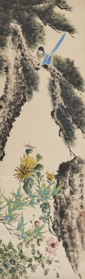 Paysage avec oiseaux, encre sur papier, montée en rouleau, signé...