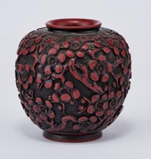 Bois laqué rouge à décor de branches de prunus en léger relief,...