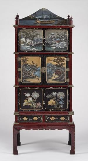 Bois laqué noir et rouge, à décor de panneaux sculptés, 107x86x4...